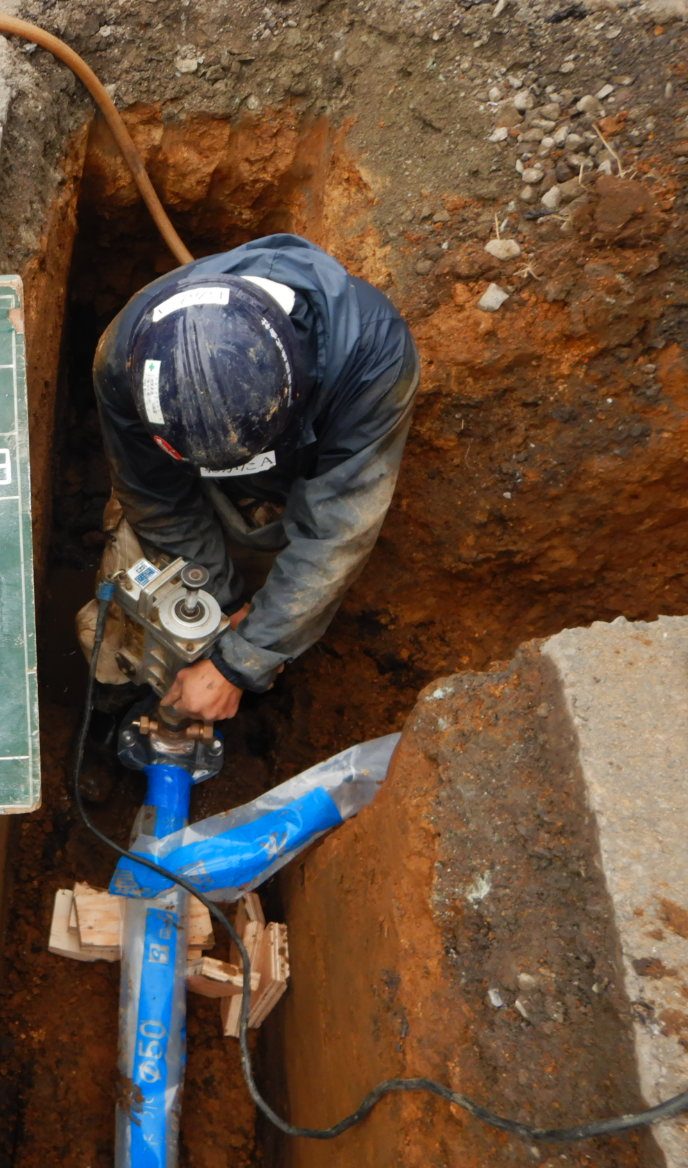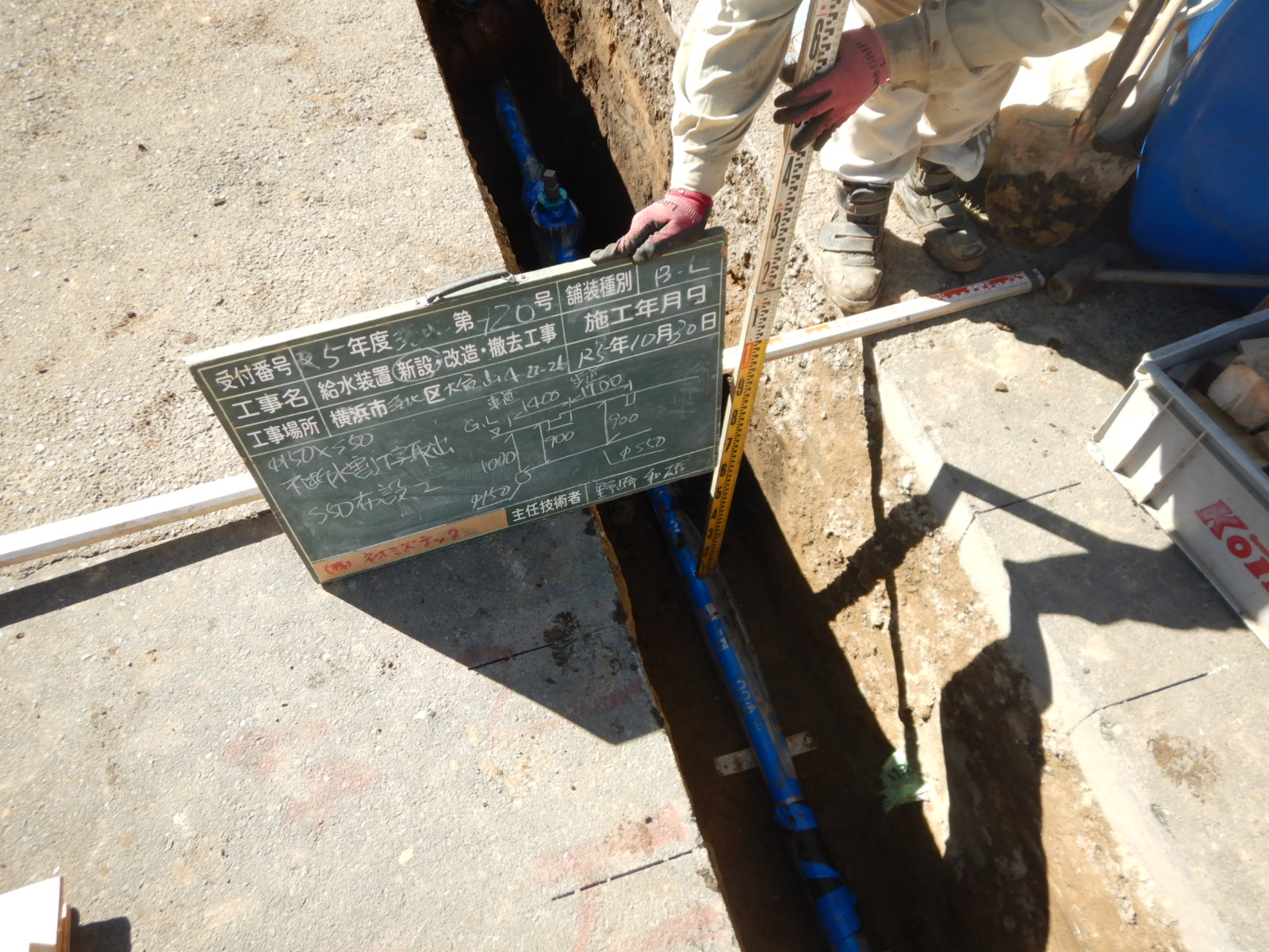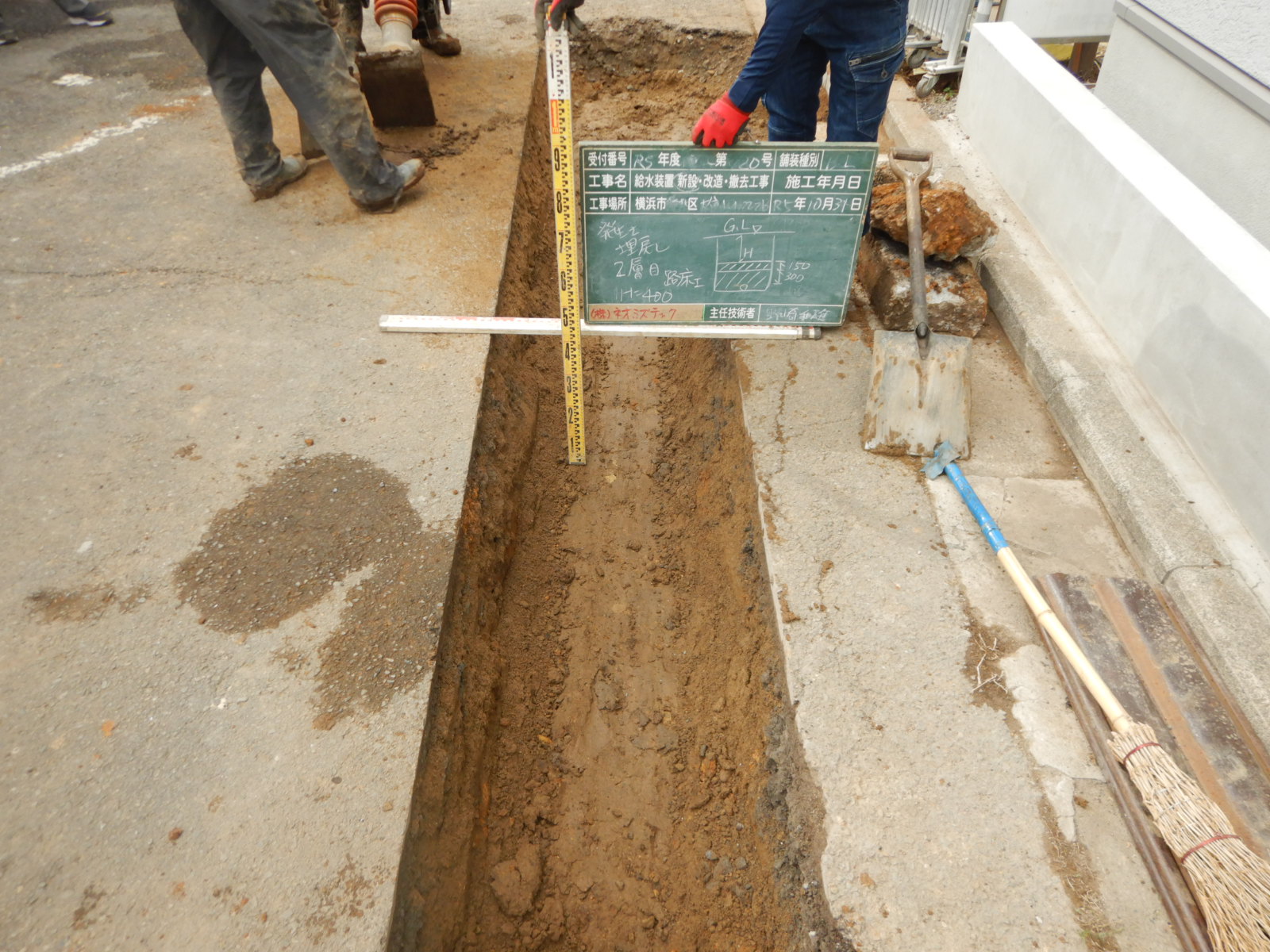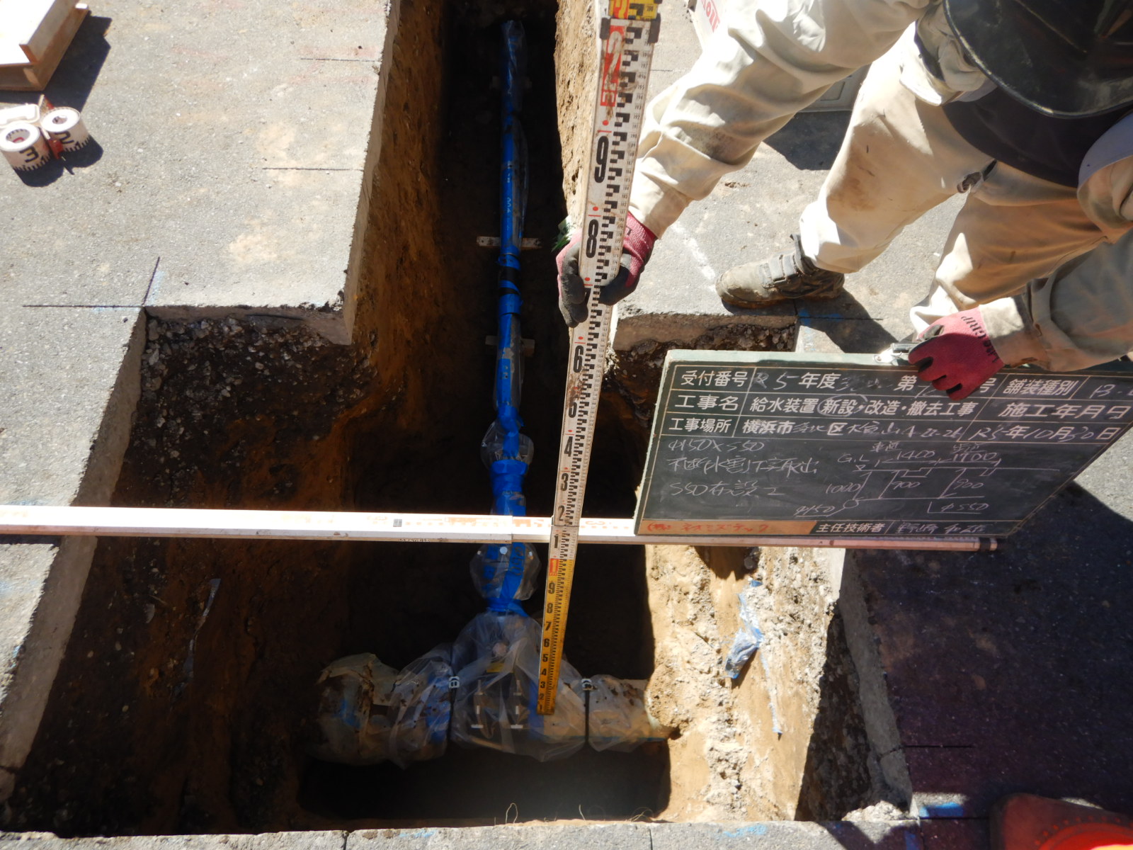 朝に資材置き場(神奈川県横浜市青葉区鴨志田町236)に集合し、3tトラックに乗り込み現場へ向かいます。現場へ到着したら、早速打ち合わせ。作業の進め方などを全員が把握した上で開始します。まずは地面に穴を掘る作業からスタートします。その後各住宅に繋がる給排水管の設置作業を行います。入れ替え後、穴を元に戻し、工事は完了。片付けをしてから、資材置き場へ戻り、翌日の段取りを打ち合わせして退社です。現在弊社では、随時職人を募集しています!少しでもご興味のある方、お気軽にお問い合わせください♪